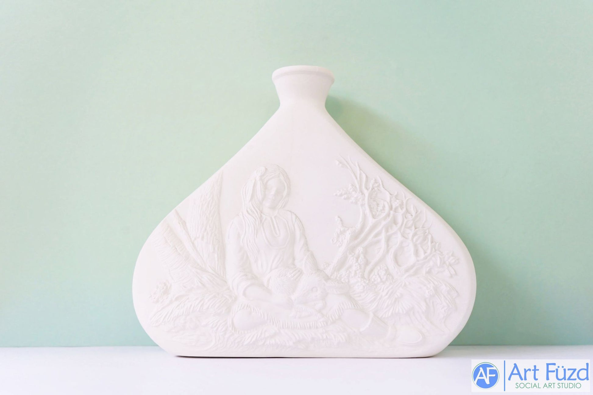 Large Triangular Vase with Girl and Deer in the Woods ~ 10.75 x 3.5 x 9