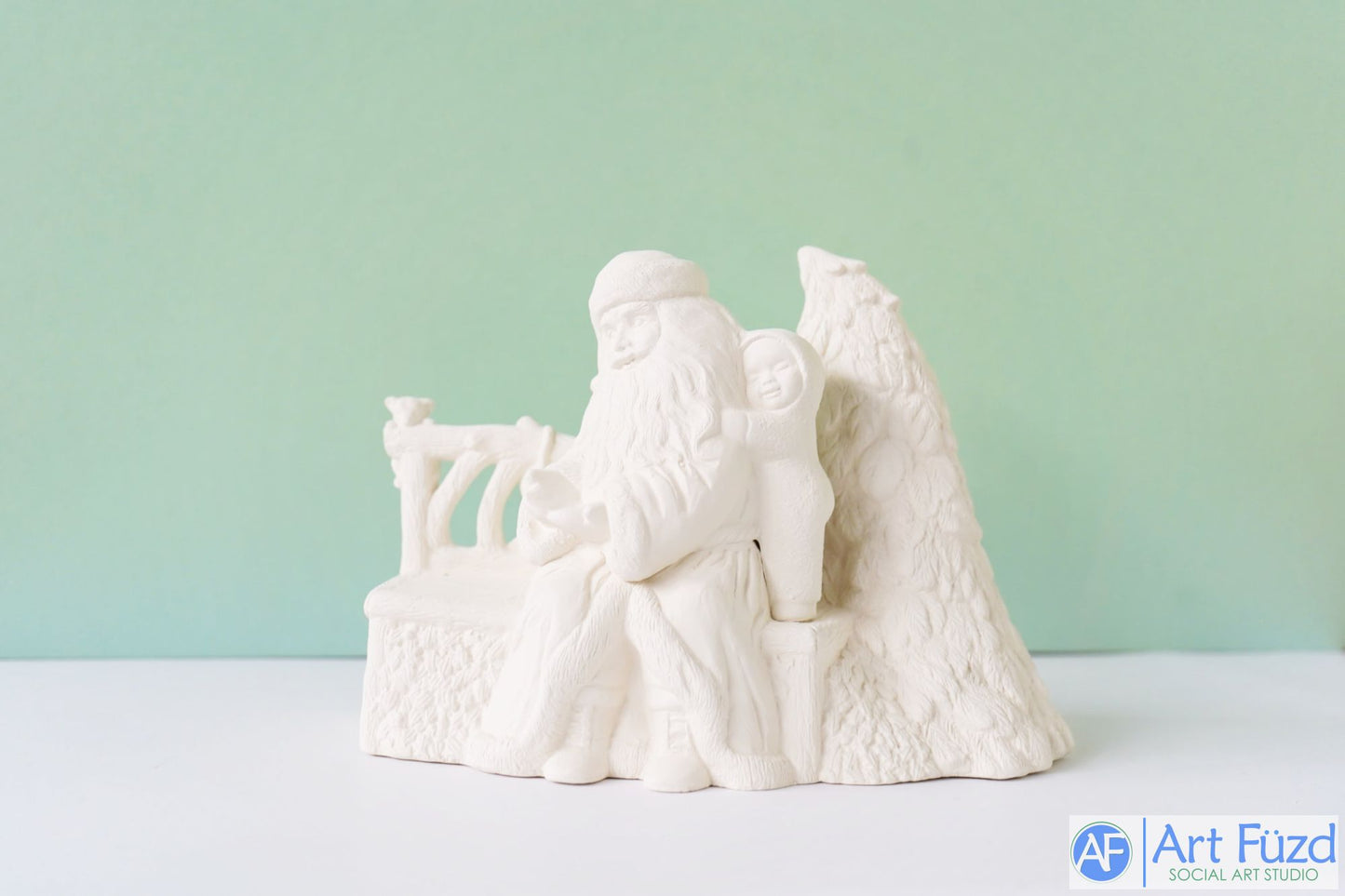 Medium Santa and Snowbaby Sitting on Bench with Tree ~ 8.75 x 5.5 x 6