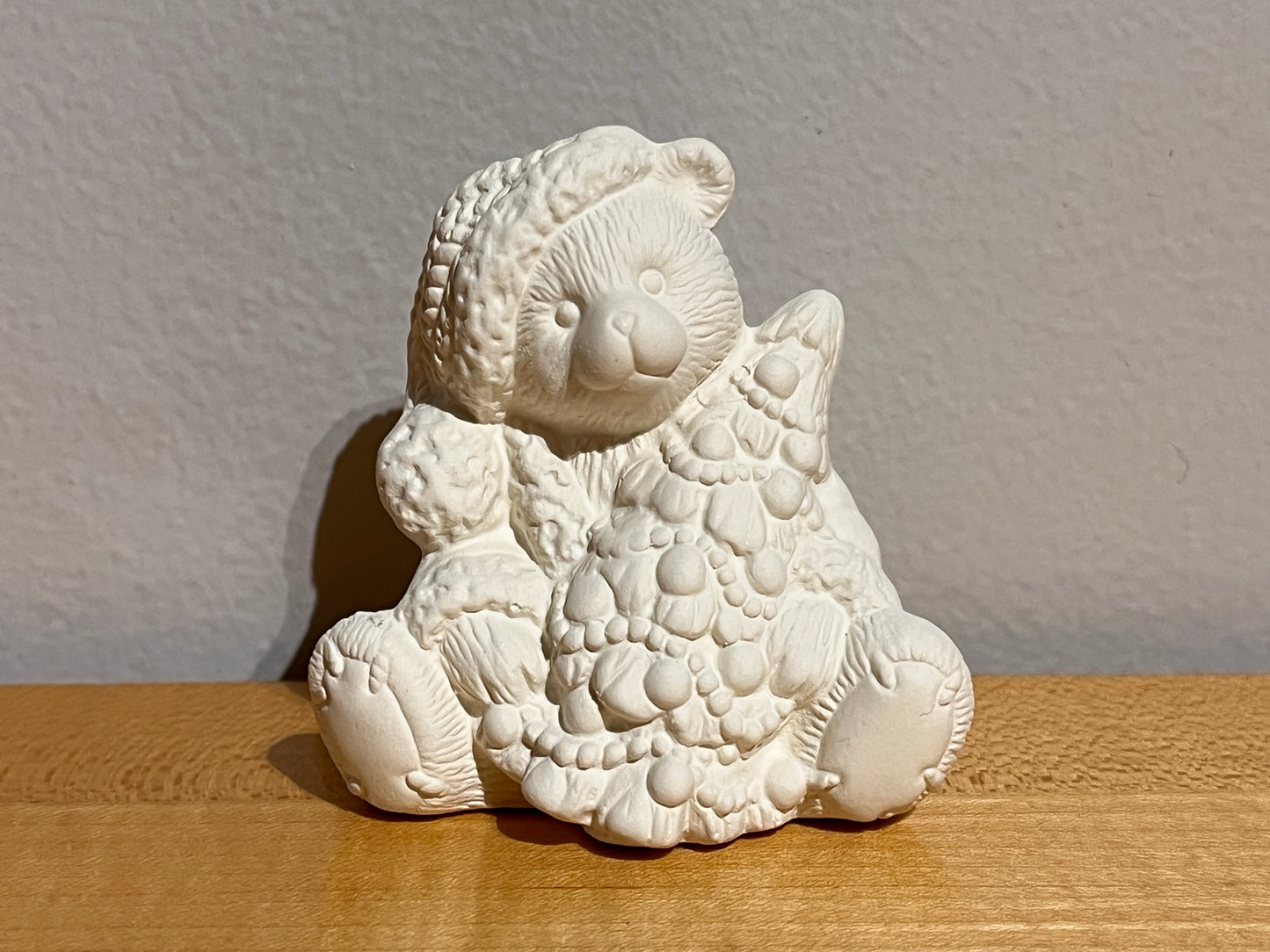 Small Sitting Christmas Teddy Bear in Crocheted Hat Holding Christmas Tree ~ 2.5 x 2 x 2.5